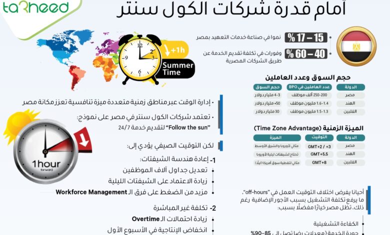 تفرض آليات التوقيت الصيفي في مصر تحديات تشغيلية متجددة كل عام على شركات خدمات التعهيد ومراكز الاتصال (BPO)، في وقت يشهد فيه القطاع نمواً ملحوظاً يعزز من مكانة مصر كمركز إقليمي للخدمات الرقمية منخفضة التكلفة وعالية الكفاءة.