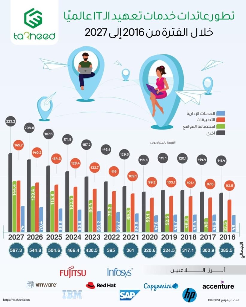 تطور عائدات خدمات تعهيد الـ IT عالميًا خلال الفترة من 2016 إلى 2027