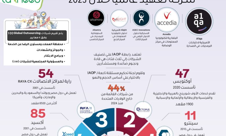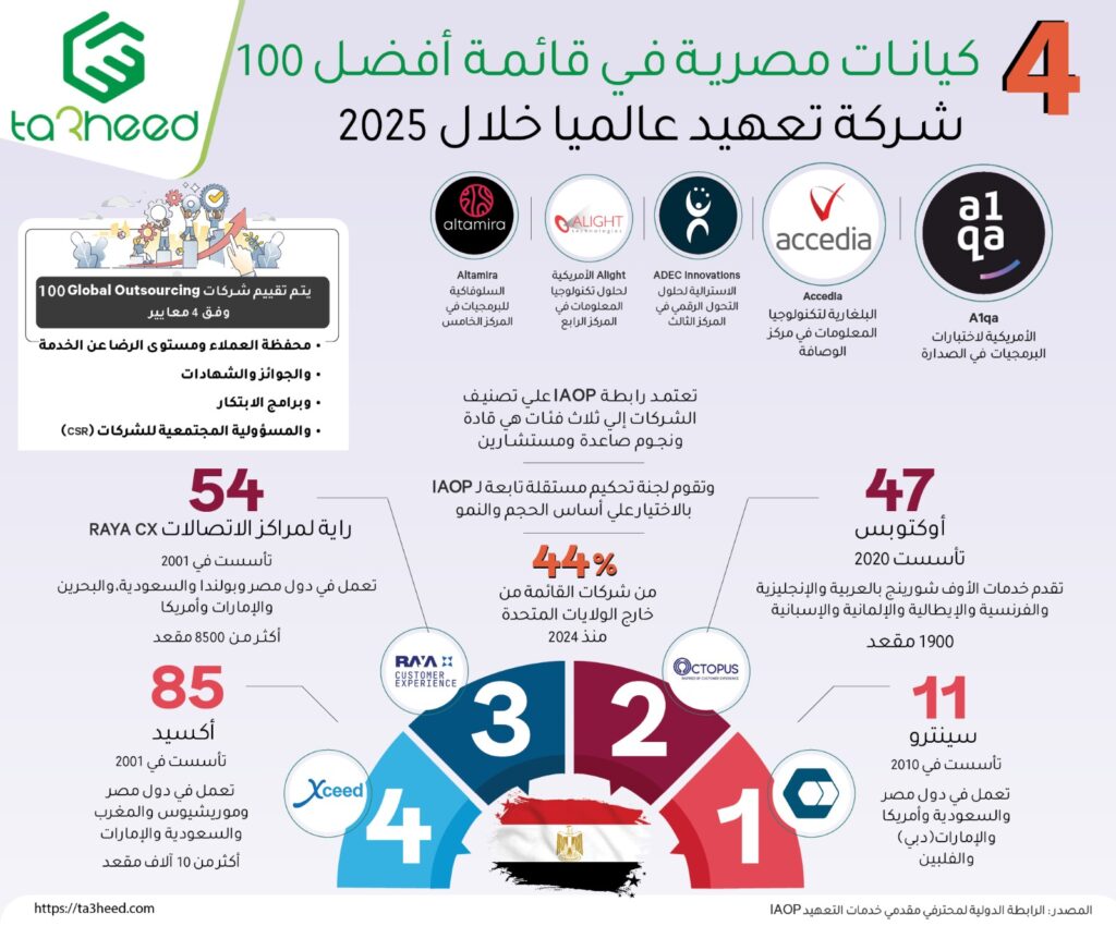 جاءت 4 كيانات مصرية متخصصة في صناعة خدمات الأوت سورسينج ضمن قائمة أفضل 100 شركة تعهيد عالميا خلال 2025 والصادرة عن الرابطة الدولية لمحترفي خدمات التعهيد IAOP.