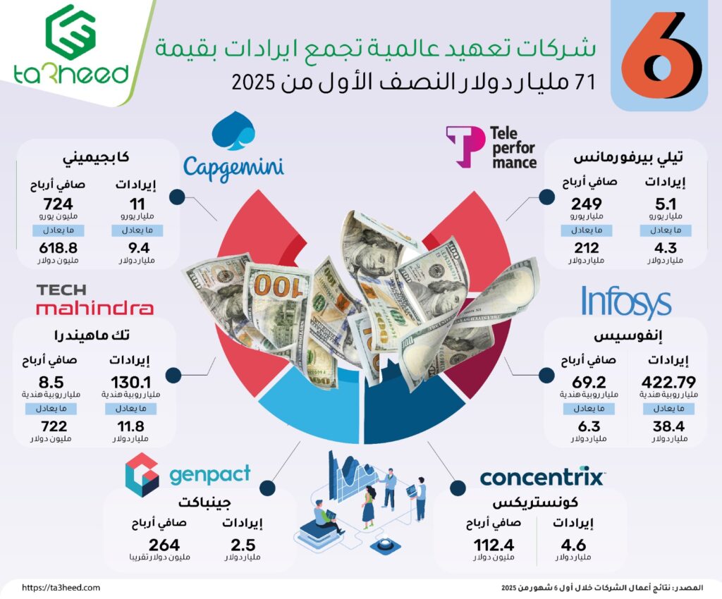 جمعت 6 شركات تعهيد عالمية إيرادات خلال النصف الأول من العام الجاري بقيمة 71 مليار دولار ، طبقا لحسابات أجرتها نشرة تعهيد بناءا علي نتائج أعمالها المعلنة .