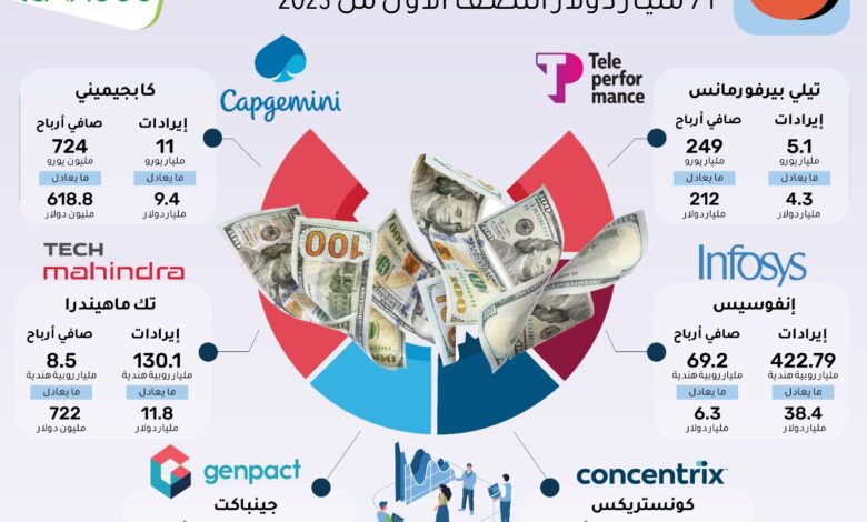 علي صعيد آخر ، جمعت كابجيميني الفرنسية إيرادات بقيمة 11 مليار يورو تعادل 9.4 مليار دولار تقريبا وصافي أرباح بقيمة 724 مليون يورو توازي 618.8 مليون دولار ، بينما حققت تك ماهيندرا العالمية إيرادات بقيمة 130.1 مليار روبية هندية تعادل 11.8 مليار دولار وصافي أرباح بـ 8.5 مليار روبية توازي 722 مليون دولار .