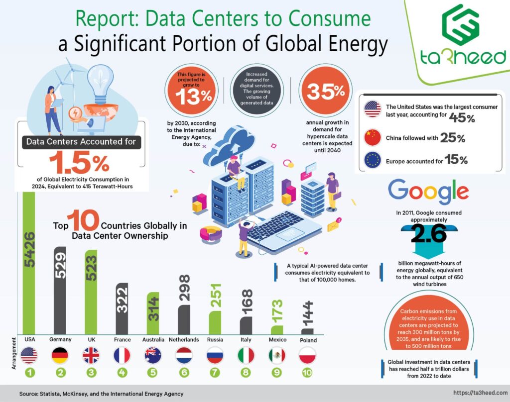 The report clarified that data centers consumed 1.5% of the world’s energy last year, equivalent to 415 terawatt-hours. It pointed out that the United States is the largest consumer at 45%, followed by China at 25%, and then Europe at 15%.
