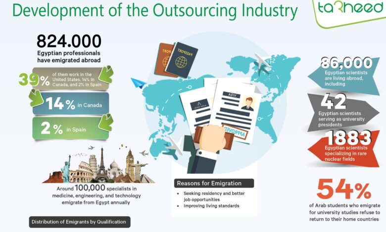 According to press reports, approximately 824,000 Egyptian minds have emigrated abroad, with 89% of them working in America, 14% in Canada, and 2% in Spain.